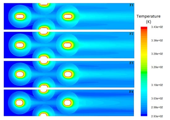 Figure 6 and Figure 7 show the local temperature distribution around the oval and flat tubes finned heat exchangers, respectively. The temperature distribution is presented in the middle of the fin thickness at a higher inlet velocity of air flow.