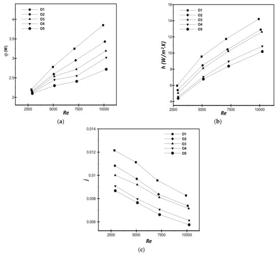 Figure 8b shows the convective heat transfer coefficient (h) versus Reynolds number for each oval tube design. Similar to the heat transfer rate, we can see that h increases with the increase of both axis ratio and Reynolds number (O1 tube shape provides 13–18% and 36–39% higher h values as compared to the O3 and O5 tube shape, respectively). This is due to the fact that the increase in the axis ratio reduces the area of the dead region (recirculation zone) behind each tube and enlarged the right and left sides of the fin surface, which are characterized by higher values of h.