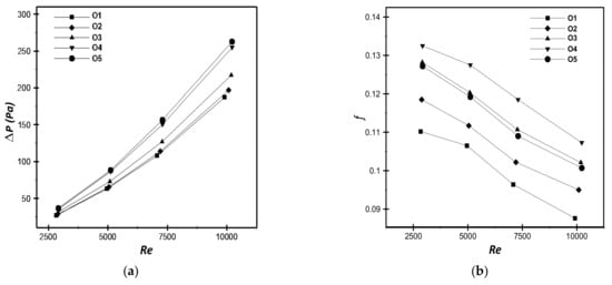 Figure 9b depicts the variation of the friction factor f for all of the inspected shapes of oval tubes at various Reynolds numbers. For all oval tube patterns, a rise in the Reynolds number results in a drop in f values. The maximum velocity and pressure loss augment with increased Re, but the resulting f decreases due to the dependence of f on the ratio of the pressure drop to the square of the maximum velocity (see Equation (14)). In addition, we can observe that O4 shows the higher values and O1 shows the lower values of f in comparison to other configurations. In fact, the O4 tube shape provides a 20–23% higher friction factor compared to the O1.