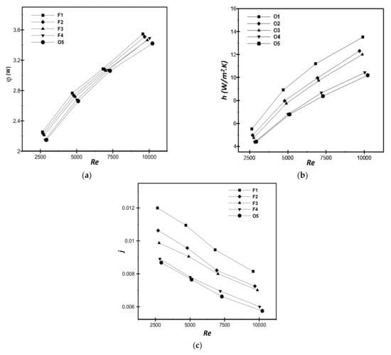 Figure 10b shows the variation of the convective coefficient (h) for all of the inspected flat tube shapes at various Reynolds numbers. Of the flat tubes, the F1-shaped tube with annular fins provides 13–16% and 25–33% higher heat transfer coefficient compared to the F3 and O5 shaped tubes, respectively; the reason is the same as for the case of oval tubes in Figure 8b.