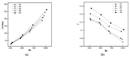 The predicted pressure drop (ΔP) and friction factor f are plotted in Figure 11a,b, respectively. For the whole range of Re, the value of ΔP decreases with the increase of tube flatness (Figure 11a). We can observe that O5 and F3 tube shapes provide, respectively, 40–42% and 16–18% higher pressure losses compared with the F1 tube design; the cause is the same as that for oval tubes in Figure 9a. Moreover, the difference in the values of ΔP between the five patterns of flat tubes becomes considerable when the Reynolds number increases.