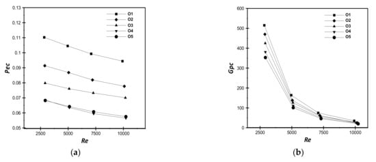 The global performance criterion Gpc is employed to obtain the optimum configuration of tubes. For the five geometries of oval tubes, Figure 12a depicts the variation of Pec for the range of 2800 ≤ Re ≤ 10,200. O1 is clearly superior, not only to the conventional circular tube (O5), but also to all other tube designs for any value of Re. As expected, the performance evaluation criterion of O1 is higher by around 61.6–64.2% than that of O4, depending on Re. Generally, the performance Pec of the oval tube fin heat exchanger decreases as the ellipticity of tubes decreases, which is due to the higher heat transfer enhancement and lower pressure losses at a higher axis ratio. Furthermore, the difference of Pec between O4 and O5 is very small, where it does not exceed 1.8% for the whole range of Re. These results agree well with the numerical results of Zeeshan et al. [] for the case of plate fins.