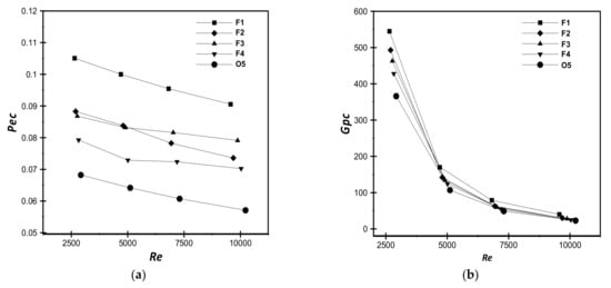 Similarly, the impact of the flatness tube on the performance evaluation criterion Pec and the global performance criterion Gpc is plotted in Figure 13a,b, respectively, for the range of Re of (2600 ≤ Re ≤ 10,200). As shown in Figure 13a, the pressure drop lowers as the flatness grows, implying that increasing the tube flatness would result in greater performance. For all the flat tube shapes, F1 shows the highest values of Pec. In addition, F1 provides 28.9–32.6% and 54–58.6% higher Pec than those for the F4 and O5, respectively.