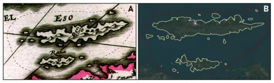 Coastal paradox demonstrated by the representation of Iž-Rava island group in Janszoon’s Map of Northern Dalmatia, Amsterdam, c. 1620 [Jan Janszoon, Iadera sicum et Aenona vulgo Zara, Sebenico et Nona cum insulis adjacentibus in parte Dalmatiae boreali, Amsterdam, c. 1620 (National and University Library, Zagreb, Map and Atlas Collection, Novak Collection, Call number ZN-Z-XVII-JAN-1620b)] (A) and Worldview imagery, 2016 (B).