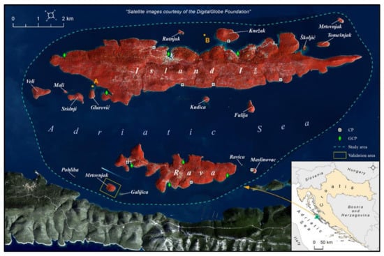 Commercial multispectral Standard 2A WV2 imagery was provided to authors through the DigitalGlobe Foundation [54]. Single multispectral (2 m spatial resolution) and panchromatic (0.5 m spatial resolution) WV2 satellite image acquired on October 28th, 2016, covering the whole Iž-Rava island group, was used as the main data for the extraction and mapping of coastlines. In order to improve geometric, spatial, and radiometric characteristics of given WV-2 images, the following three preprocessing steps were performed: (1) radiometric correction; (2) image pansharpening; and (3) image geometric correction.