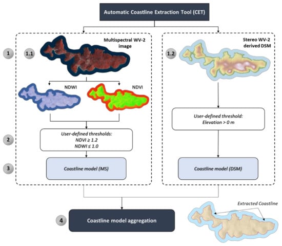 In the first step (1), the user defines the input data for CET, where specific spectral bands of multispectral image and corresponding DSM have to be selected. Unlike already existing methods (Table 1), which only use spectral information for the extraction of coastlines, CET uses both spectral and elevation information. While three spectral bands (coastal (C), red (R), and near-infrared 2 (NIR2)) from selected multispectral image (1.1.) are used for the calculation of specific spectral indices, the selected DSM (1.2.) adds the optional possibility to use elevation information for coastline extraction. Spectral indices used for the extraction of coastline are the Normalized Difference Vegetation Index (NDVI) and the Normalized Difference Water Index (NDWI), as those were already used for successful coastal extraction in some previous research [5,14]. NDVI and NDWI spectral indices were calculated according to the following equations [14]: