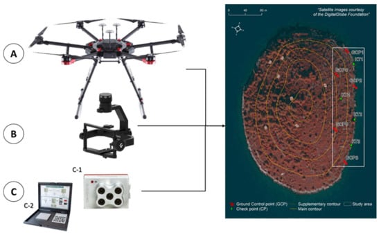 Different components (A,B,C-1,C-2) functionally integrated into MAPS (left); spatial extent of the multispectral UAV photogrammetric survey (right).