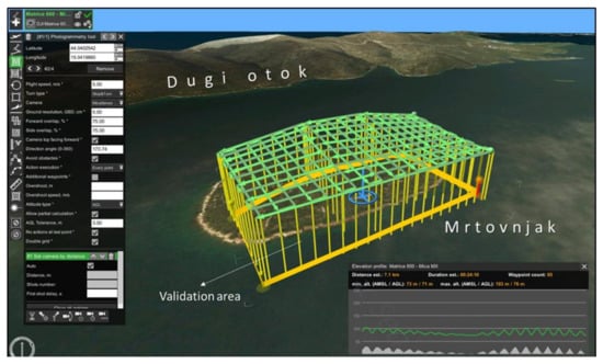 The spatial extent and parameters of the photogrammetric flight mission were planned and automated within the Universal Ground Control Software 3.3.348 (UgCS) application. The ground sampling distance (GSD) of the planned flight mission was set to 5 cm, forward and side overlap were set to 75%, constant flight height was set to 73.3 m above the ground level, and double-grid flight profiles were chosen during the planning of flight missions (Figure 5). In order to improve the overall georeferencing of created models, nine GCPs were introduced within the validation area, whose precise coordinates were collected using Stonex S10 RTK-GNSS and harmonized according to the available tidal data. A multispectral camera was calibrated using the calibration panel (Figure 4C-2) before and after the conducted flight mission. In total, 2319 multispectral images were collected within the carried survey.