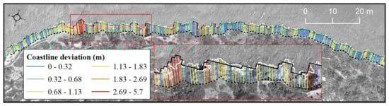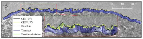 The validation of horizontal accuracy of the CET-WV-derived coastline was performed by Digital Shoreline Analysis System v. 5.0 (DSAS), an add-in published by the United States Geological Survey (USGS) for the ESRI ArcGIS v.10 software [71]. The DSAS extension allows the user to define a reference line (baseline), which serves as the basis for projecting transects perpendicular to that baseline (Figure 7). Mainly, DSAS is used for the calculation of coastline displacement [72] using the traces of several historical coastlines, attributed to different time intervals, where DSAS simply measures the distance between the baseline and the intersections of the coastlines within each transect, e.g., [73,74]. These measurements provide quantitative information and different useful statistical data about the change in position of the coastlines within the surveyed period.