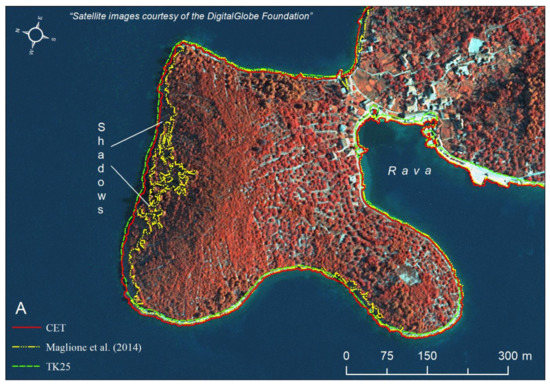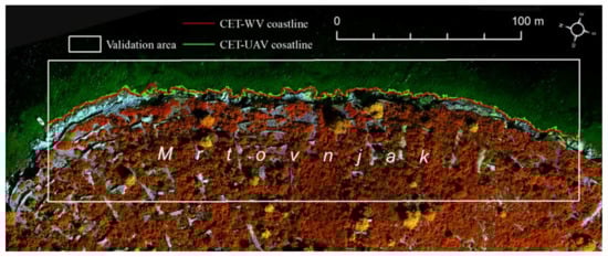 A further validation assessment of CET-WV coastlines was performed within the second chosen validation area, which encompassed the 300 m long segment of the Mrtovnjak island coastline (Figure 6B).