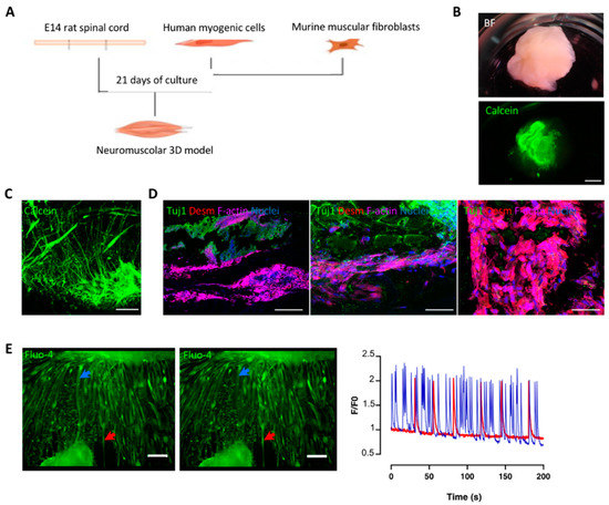Based on our previous results and on the neurotrophic properties of dSkM [16,17], we generated the neuromuscular construct by co-seeding human myogenic cells and murine fibroblasts into the dSkM together with oSpC onto the scaffold (Figure 2A). Calcein live-imaging performed at the fluorescence stereomicroscope, confirmed the presence of viable cells after 21 days of co-culture (Figure 2B). We did not observe significant differences in biological and technical replicates of the developed co-cultured models in terms of cell viability, morphology, and scaffold repopulation at the end of the experiments. Interestingly, 2-photon imaging analysis revealed the presence of elongated cells resembling myotubes in strict proximity to cellular projections similar to neural axons (Figure 2C). Confirmation of the preservation of both neural and myogenic cells was provided by immunofluorescence analysis for the marker class III-beta tubulin (Tuj1) and desmin, respectively (Figure 2D). Moreover, these data also confirmed that neural extensions and myogenic cells were in close proximity to each other within the dSkM (Figure 2D). Based on these findings, we wanted to investigate whether such co-culture could have a basal physiological activity. To do so, 3D neuromuscular constructs were cultured for 21 days, treated with the Fluo-4 calcium dye, and subjected to live imaging analysis to eventually reveal calcium fluxes into the myogenic compartment. Despite the fact that monitoring Fluo-4 within the 3D neuromuscular construct was not possible due to thickness and autofluorescence of the construct, myotubes located to the margins between the spinal cord and the dSkM clearly showed physiological activity (Figure 2E and Supplementary Video S1) with quantifiable calcium spikes (Figure 2E, left panel).