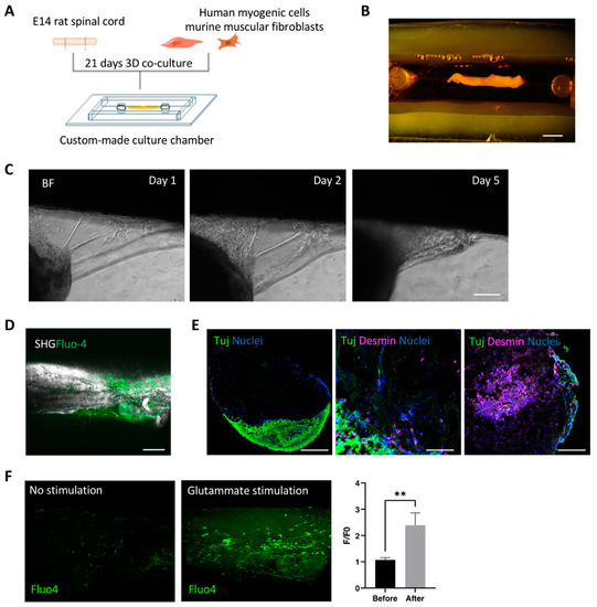 Characterization of 3D neuromuscular construct cultured in custom-made PDMS chamber. (A) Schematic illustration of the experimental set-up within the custom culture chamber. (B) Representative image of muscle scaffold allocated into the PDMS chamber. Scale bar, 1 mm. (C) Bright field high magnification images of organotypic spinal cord section 1, 2 and 5 days after seeding. Scale bar, 500 μm. (D) Representative 2-photon and second harmonic generation imaging of Fluo-4-positive (green) cells within dSkM ECM (white). Scale bar, 500 μm. (E) Representative images of immunofluorescence analysis for βIII-Tubulin (Tuj1, green) and nuclei (blue) of the 3D neuromuscular constructs. Scale bars, 500 μm, left and right panels; 200 μm, middle panel. (F) Left panel, Fluo4 two photon-mediated calcium imaging of 3D constructs before (left) and after (right) glutamate stimulation. Right panel, Scale bar, 500 μm. Right panel, quantification of calcium fluorescent ratio (F/F0) of images acquired before and after glutamate stimulation. Data are shown as mean ± s.d. of three independent replicates; **, p < 0.05.