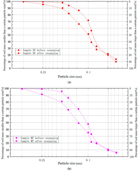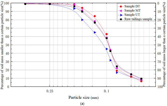 As can be seen from Figure 9, the average particle size of sample DT (Column 1), sample MT (Column 2), and sample UT (Column 3) is increased by 6.4%, 12.0%, and 2.4%, respectively, due to the migration of the fine-grained tailings along the seepage direction. About 20% of tailings with particle size smaller than 0.075 mm and 10% tailings with the size of 0.075~0.1 mm migrated to the downstream in the sample DT according to Figure 9a. The change in average particle size of each tailings sample is not obvious; however, the mass of tailings with the particle size below 0.1 mm increased by about 4% in sample UT according to Figure 9c.