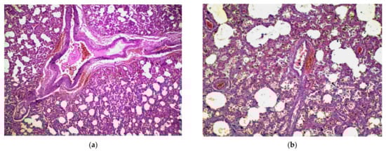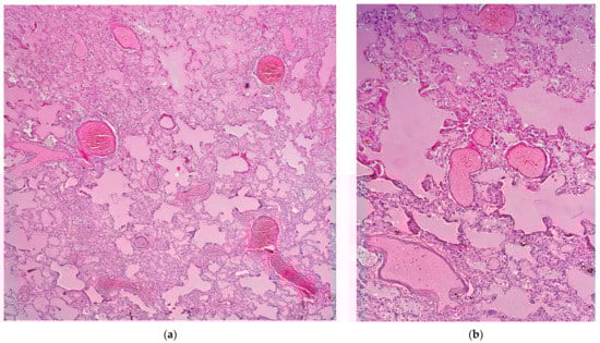 HE stain of infant pulmonary tissue, suggestive of viral interstitial lesion: (a) 100×—severe vascular stasis and thick alveolar septs; (b) 400×—vascular thrombosis, infiltration of lung tissue with inflammatory cells, especially in the thick alveolar septs.