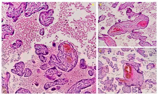 (A) 100× and (B,C) 400× HE stain of placenta (second half of gestation period), with vascular stasis and recent thrombi, lacking signs of endothelial activation, minimal inflammatory infiltrate, perivillous fibrin, and increased syncytial knotting.