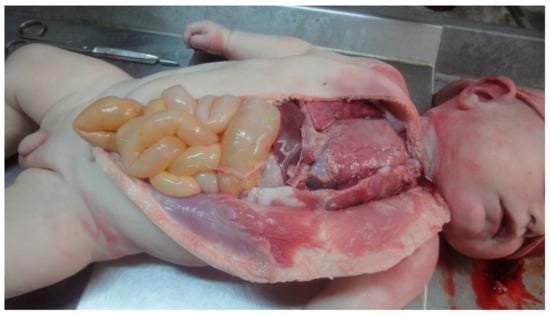 The uterus is flaccid, with a gray–purple serosa, and measures 26 cm longitudinally, 24 cm latero-laterally, with a thickness of 15 cm, and, upon examination, a milky, yellow-grayish liquid and a female fetus are observed.