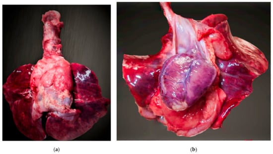 Internal examination of the body: purple–brownish lungs, with increased consistency and multiple subpleural petechiae, disseminated bilaterally (Figure 6a). Upon examination, crepitations were present, and on the section surfaces low-volume leakage of liquid blood was present. During the hydrostatic test, larger and smaller fragments of lung partially floated in water. A free pericardial cavity was observed, with epicardial, disseminated petechiae. The heart measured 5/3.5/2.5 cm and the cavities contained traces of liquid blood. The myocardium was pale-brownish, with a normal consistency and a width of 0.3 cm at the right ventricle and 0.6 cm at the left ventricle, displaying multiple areas of macroscopically visible thrombosis (Figure 6b).