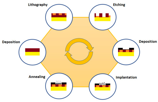 So far, different algorithms have been developed to perform defect detection and classification tasks. In the beginning, when the emerging semiconductor manufacturing industry was less automated, human operators would be able to perform the inspection operations manually with the help of optical microscopes due to the larger size of the defects appearing on the wafers. Then, as the size of the defects decreased, the need for some sort of alternative to help human operators perform the inspection task grew. That growing need was met with the help of computer vision and new microscopy techniques [2]. The typical steps that are commonly followed in order to manufacture a semiconductor wafer are depicted in Figure 1. The manufacturing process is not linear. It is composed of hundreds of repetitions of the operations that collect the figure. A single error in one of those repetitions could jeopardize the whole manufacturing process [3]. As a result, today it is common for an expert to identify defects by visual judgement using a scanning electron microscope (SEM) after each of these steps along the manufacturing chain. Manual surface inspection methods conducted by quality inspectors suffer from the disadvantages of low efficiency, high labour intensity, low accuracy and low real-time efficiency [4]. These weaknesses can be addressed by using advanced computer vision techniques.