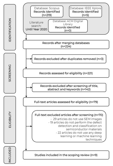 Figure 2 schematically shows the application of the inclusion and exclusion criteria. The process of refinement was carried out in three stages: initial search, selection and inclusion. Throughout the initial search stage, the raw results of the databases were collected. Up to 224 articles were found in total, 219 in Scopus, 5 in IEEE Xplore and none in the ACM Digital Library. In the selection stage, the duplicated documents were eliminated. As many as 3 documents were duplicated. Then, another 143 documents were removed after reading the abstract, title and keywords. As the terms were searched throughout the full document, those 143 articles clearly did not address the objective of the review. Finally, at the inclusion stage, 70 more papers were removed from the list after careful reading. Another 29 of them were eliminated for not using SEM images. In fact, SEM was mentioned throughout the article, but other devices were used to construct the data sets. Another 19 articles were removed because they did not perform defect detection on semiconductor materials. Again, semiconductor materials were mentioned in the full text, but defect detection and classification was devoted to other types of materials and defects. Finally, 22 articles that did not employ machine or deep learning were removed. These techniques were mentioned in the articles as future work or an alternative. Therefore, solely 9 of the 224 initial documents remained on the list. The fact is that this may seem like a really low number of articles. However, to the authors’ knowledge, all papers related to the subject of the review have been collected. These 9 documents will be used for the detailed study.