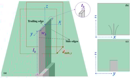 Geometry parameters of the PZT fan blade and the illuminated plane for the PIV measurement, with frame (a) showing geometry parameters (b) showing the transverse plane (x-z plane) and frame (c) showing the longitudinal plane (y-z plane).