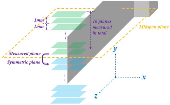 The 3D vortex structure was constructed by combining a group of 2D transverse plane along the y axis, 1 mm apart (see Figure 3). The transverse measurement plane was first placed at the midspan. After each PIV measurement, the plane translated along the positive direction of the y axis for dshify,y = 1 mm. Due to the symmetric nature of the PZT fan blade, 16 planes are extracted from the midspan of the blade to the plane 15 mm away from the midspan in +y direction. To better visualize the 3D vortex structure, the measured data is mirrored at the mid-span to construct the other half. The 3D vortex structure at each phase is (defined in the next section) constructed by 32 2D ensemble-averaged flow field image. This procedure is also used in other studies [15,16,17].