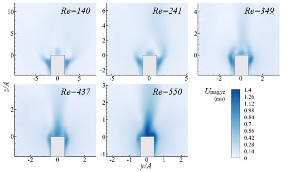 Time-averaged velocity magnitude (Umag,yz) field of the y-z plane at different Reynolds numbers.