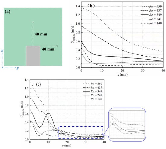 Velocity magnitude at streamwise and spanwise lines: (a) schematic of the lines for data extraction, (b) velocity magnitude profile of the flow field along the line of y = 0, 0 < z < 40. (c) Velocity magnitude profile of the flow field along the line of z = 0, 0 < y < 40.