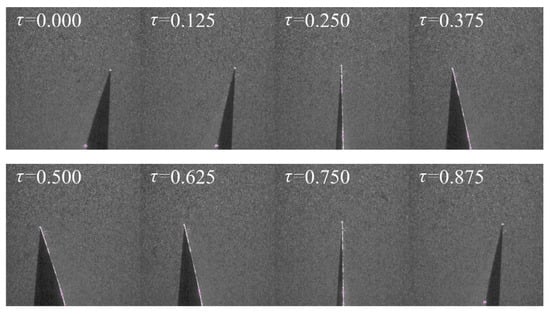 The characteristics of the vortex generated by the vibration of the PZT fan blade is another key issue that has been widely discussed in previous studies. In order to obtain the vortex structure, an ensemble-averaged method for eight different phases τ was adopted here. Here, τ = t/T where t represents time and T is the time of an oscillation period. The position of the PZT fan blade at these phases are shown in Figure 9. For every single phase, 200 pairs of images are used for the ensemble averaging.