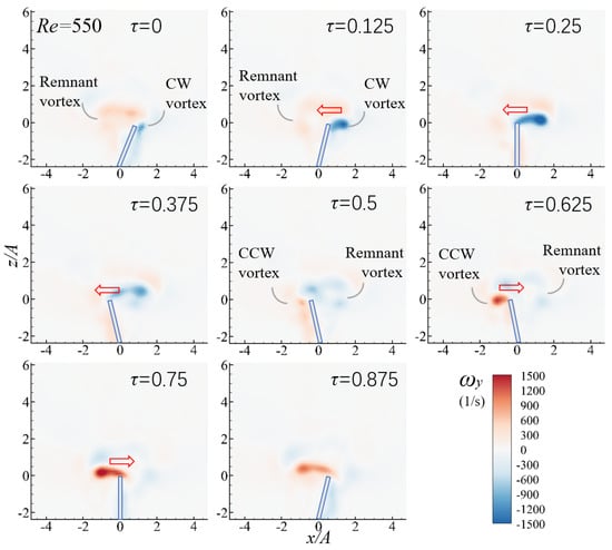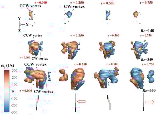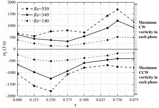 During an oscillation cycle, the intensity of the CW and CCW vortex changes. Figure 11 shows the variation of the maximum y-component CW and CCW vorticity during a cycle. For different cases, the tendency of the maximum ωy is basically the same. The CW vortex reaches the maximum intensity around phase τ = 0.25 and the CCW vortex reaches the maximum intensity around phase τ = 0.75 for all cases. With the increase in the Reynolds number, the maximum intensity for both the CW and CCW vortexes are enhanced at different phases.