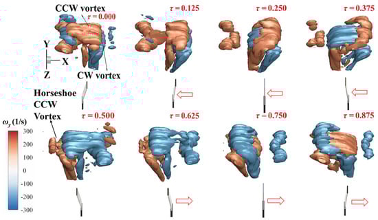 At two side edges of the blade, there is also a vortex generated. Together with the vortex at the trailing edge, a horseshoe structure is formed, which has been shown in Figure 13a. The CW vortex continues to develop in the later phases and the head of the horseshoe vortex is elongated in x-direction. At phase τ = 0.5, when the blade changes the direction of movement, two distinct vortex rolls are observed. This demonstrates the shedding of the CW vortex. The vortex shed from the blade tip then develops into a hairpin structure (see Figure 13b) and gradually diffuses in the flow field. The part still connected to the blade tip eventually detaches as the blade moves towards the right, then it propagates and dissipates as traveling in streamwise direction. The formation of the horseshoe vortex and hairpin vortex is consistent with previous studies reported in [15,16].