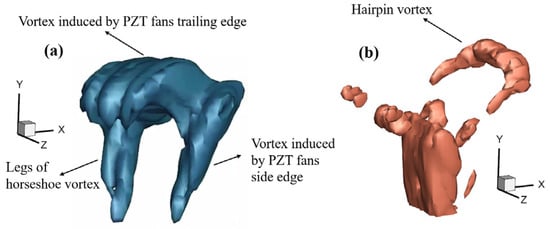 Typical flow structures generated by PZT fan: (a) a CW horseshoe vortex at τ = 0.25, (b) a hairpin vortex at τ = 0.375.