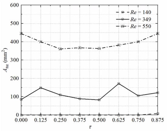 To evaluate the area affected by the turbulence, we calculated the area encompassed by the contour line of TIyz = 0.05 at different phases as Atur,yz. As can be seen in Figure 16, Atur,yz is close to 0 at a low Reynolds number (Re = 140). As the Reynolds number increases to Re = 349, the Atur,y is alleviated, ranging from 80 mm2 to 170 mm2. At Re = 550, the Atur,y is further increased by almost 2 to 3 times.