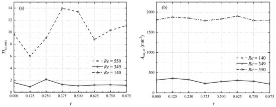 Figure 17a illustrates the maximum turbulence intensity TIxz,max at different phases in the transverse plane. Similar to the longitudinal plane, the maximum turbulence intensity is close to 0 for all phases when Re = 140. When the Reynolds number increases to 349, the TIxz,max fluctuates between the 1 to 2, and the range is wider comparing to the longitudinal plane. At Re = 550, the TIxz,max varies from 6 to 14. From Figure 17b, the area affected by turbulence at different phases extended as the Reynolds number increases. Comparing to the longitudinal plane, the Atur,xz is larger at the same Reynolds number, which is due to the stronger vorticity exhibited in the transverse plane.
