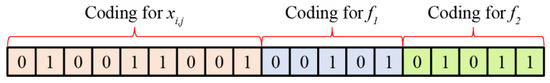f2, respectively. The binary encoding of the chromosome is shown in