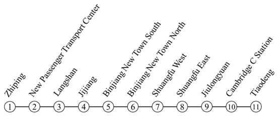 The Jiangjin Line is a radiating urban rail transit line with a terminal station connected to Chongqing’s No. 5 Metro Line. The majority of the passengers on the Jiangjin Line travel to the city center. As a result, many passengers transfer from the Jiangjin Line to the No. 5 Metro Line at the Tiaodeng Station (station No. 11). The passenger flow volume on the Jiangjin Line gradually increases in the direction of the city center.