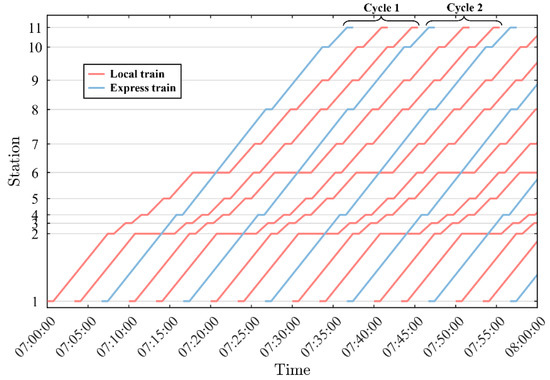 Based on the above-calculated departure interval and inter-station travel times combined with tz, the arrival and departure times of each train at each station can be calculated using Equations (3)–(5). The arrival and departure times of an express train at a station where it does not stop are the same.