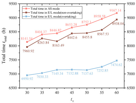 (1) With the increase in stop time tz, the total travel time of passengers ttotal increases. The increase in tz has a greater impact on the ttotal in AS mode than other modes. As tz increases from 30 to 60 s, the ttotal in AS mode increases by 1025.6 h (12.60%), from 8141.54 to 9167.14 h, while the ttotal in E/L mode with the overtaking condition increases by 523.7 h (7.53%) from 6950.92 to 7474.62 h, the ttotal in E/L mode without the overtaking condition increases by 977.12 h (12.27%) from 7960.92 to 8938.04 h.
