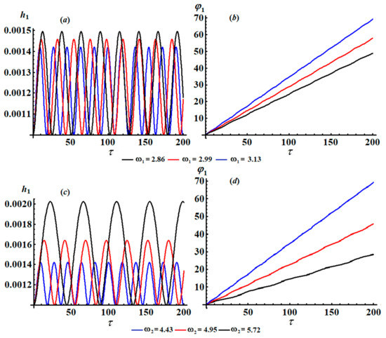 This system is known by the system of modulation equations that consists of four first order ODEs in terms of amplitudes and modified phases . The equations can be solved based on the initial conditions after transformation to new variables. The attained solutions are drawn in Figure 2 and Figure 3 for different values of and , in which the following parameters are used: