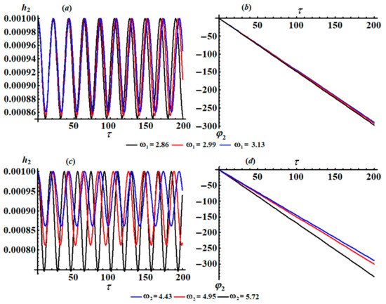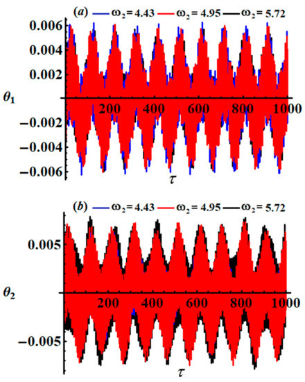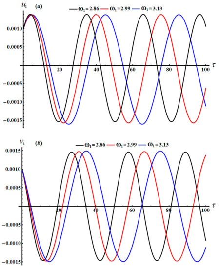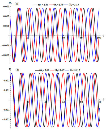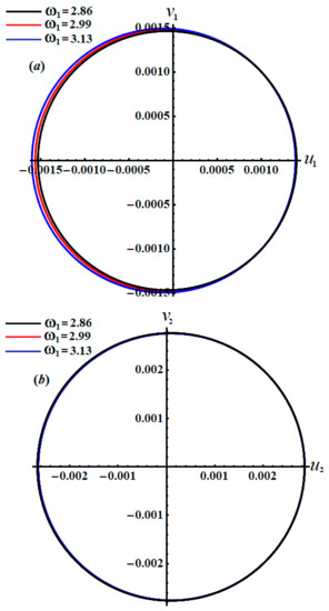 The time histories of and , as specified in system (46), are depicted in Figure 12 and Figure 13. It is appropriate to mention that the drawn curves in these figures have a progressive periodic manner, in which the number of oscillations decreases with the increasing in values and the wavelength of the waves increases. Moreover, we can predict that the motion of the studied system is stable. Parts (a) and (b) of Figure 14 explore the plots of the phase planes in the presence of various values of the frequency . It is observed that symmetric closed curves are portrayed to assert our prediction of the stability and the steady motion of the investigated system.