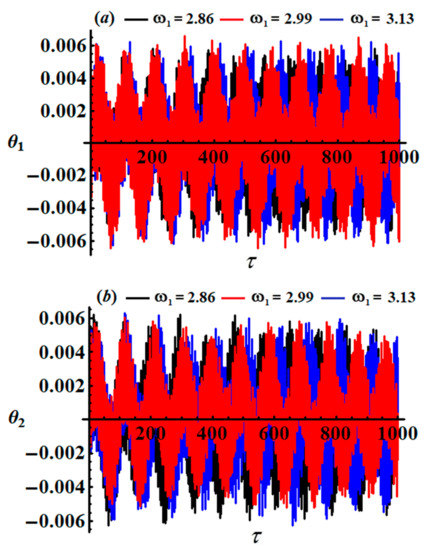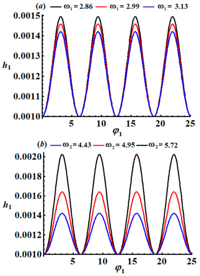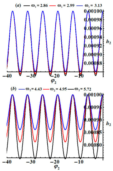 An inspection of the curves of Figure 5 shows that the amplitudes of angle decrease with an increasing as seen in Figure 5a. However, the amplitudes of angle increase with the increase in values, as indicated in Figure 5b.
