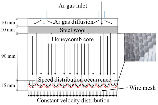 Figure 2 shows the shape of the local shield developed in this study. The overall dimension was 180 mm in horizontal length, 80 mm in width, and 125 mm in height. To configure the local shield, we referred to the paper by Bermingham et al. [6]. Ar gas was supplied from two holes on the top of the local shield using tubes. The supplied gas was diffused by a layer of steel wool with thickness of 10 mm, and rectified downward by the rectifying action of the honeycomb core located in the lower layer. The cell size of the hexagonal honeycomb core was 6.35 mm. Immediately below the honeycomb core, a velocity field was generated according to the distance from the wall due to viscosity, so the Ar gas was passed through a wire mesh with a spatial ratio of 0.37 to equalize its velocity and supply it directly above the shaped bead. In addition, the cover shown in Figure 3 was attached to the lower part of the local shield to protect the space from the lower part of the local shield to the substrate. This blocked off the area under the local shield from the outside, making it easier to reduce the O2 concentration in the high-temperature deposition part.