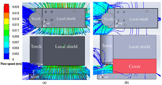 Figure 4. Flow velocity field of Ar gas supplied downward from local shield. (a) Without cover underneath local shield; (b) With cover underneath the local shield.