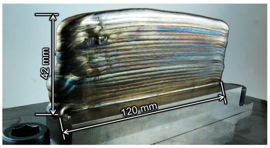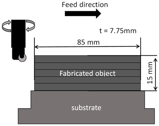 Figure 8 is a schematic diagram of how the fabricated object was milled; Table 2 lists the cutting test conditions; and Table 3 shows the welding conditions for the test object to be machined. The fabricated object was a 10-layer wall shape, 7.75-mm wide, 85-mm long, and 15-mm high. The top surface of the specimen was machined in the test. To reduce the fabricating height error, the feed rate within one path was changed as detailed in Table 4. Since the ends of the fabricated object were not uniform in shape, they were cut off by wire electric discharge machining so that the amount of cutting could be constant during milling. The sides of the fabricated object have the unevenness characteristic of WAAM, but the width was within the range of 7.67–7.81 mm. The cutting distance for each pass was 20 mm, and the cutting force from the start of milling to 0.5 s was defined as the initial stage cutting force. The average values of the maximum cutting forces in the range of 0.2–0.5 s were compared. The heating temperature during milling was set at room temperature, 50, 100, 150, 200, 250 and 300 °C.