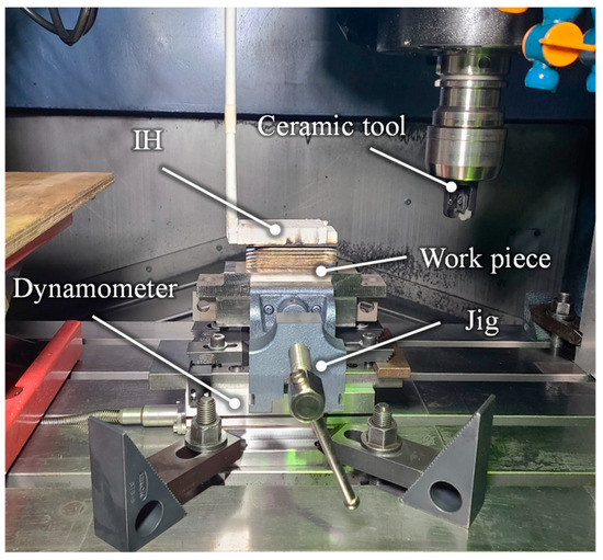 Figure 6 shows the experimental setup of milling test. A machining center (Yamazaki Mazak, FJV-250 UHS) was used for the high-temperature milling test. We used an induction heater (IH) to elevate the temperature of the fabricated object to about 300 °C to perform the high-temperature milling. In the experiment, a dynamometer (Kistler 9257B), a vise, and an object fabricated by WAAM were attached to the table of the machining center to measure the cutting force. A thermal camera (FLIR T650s) was used to confirm the heating and cutting temperature. Emissivity was set to 0.42 when measuring the temperature with the thermal camera; this was to ensure the temperature of the surface coated with Black-body spray coincided with that of the titanium alloy surface.