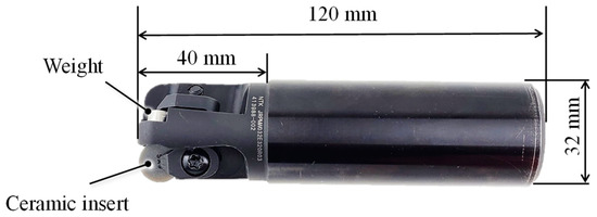 Figure 7 shows the ceramic tools used in the experiment. The tool insert was a round-type silicon nitride-based ceramic insert (NGK Spark Plug Co., Ltd., RPGN120400T00525: SX9), which has excellent high-temperature strength and wear resistance. The tool diameter was 32 mm. A 3-flute cutter body was used, but only one insert was attached to the cutter body to measure tool wear and to eliminate the influence of tool runout. The other insert mounting positions gripped a weight equal to the insert to suppress weight imbalance.