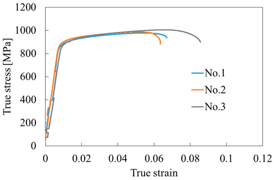 Figure 9 shows the dimensions of the tensile test piece. Since the test piece might be deformed due to residual stress generated during the deposition process, the built object was subjected to stress-relief annealing under the conditions shown in Figure 10. The test piece was then cut out by wire electric discharge machining. The tensile direction was parallel to the torch traveling direction. We do not consider anisotropy between the deposition direction and the torch traveling direction here. The applied load during the tensile test was measured by the load cell at the upper crosshead of the tensile testing machine, and the strain and elongation were measured with both a strain gauge attached to the tensile test specimen and a digital extensometer. The crosshead moving speed was 5.0 mm/min. Figure 11 shows the true stress–strain diagram of each test piece. The tensile strength of each test piece was between 931 and 946 MPa; the 0.2% proof stress was between 891 and 892 MPa; and the elongation ranged from 6.6–8.9%. According to JIS H4657 of the Ti-6Al-4V forging material standard, tensile strength, 0.2% proof stress, and elongation are 895 MPa or more, 825 MPa or more, and 10% or more, respectively. Based on this standard, the tensile strength and 0.2% proof stress met this required standard for forging material, but the elongation was slightly below the standard value. Elemental analyzers then evaluated the composition of the test specimen. An oxygen/nitrogen analyzer (HORIBA, Ltd., EMGA-900) was used to analyze light elements such as O2, and an EDX (AMETEK, EDAX) was used to analyze other elements. We considered that one of the causes of the slightly smaller elongation was the influence of O2 concentration in the deposited object. The local shield and cover were developed to reduce the O2 concentration in the fabricating atmosphere, but their effect might have been limited. Table 4 presents the elemental analysis results of the specimen, and the wire material supplied to the WAAM process. For reference, values for the aircraft standard AMS4911 for Ti-6Al-4V are also given in the table. The O2 concentration in the test specimen was 0.232%, slightly higher than the upper limit of O2 concentration of 0.20% for the aircraft standard ASM4911 of Ti-6Al-4V. The slight difference in the oxygen concentration in the parts, 0.2% and 0.23%, may be one of the reasons for the reduction in elongation. Nevertheless, the O2 concentration might be sensitive to elongation. The values of N and H in the modeled object were slightly larger than those in the wire material, but not by a problematic amount. The amount of Al was also smaller than the value in the wire material. It is considered that vaporization occurred under the high-temperature state in the plasma during the process, resulting in a decrease of component amounts.