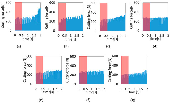 Figure 12. Cutting force transition affected by the heating temperature. (a) R.T.; (b) 50 °C; (c) 100 °C; (d) 150 °C; (e) 200 °C; (f) 250 °C; (g) 300 °C.
