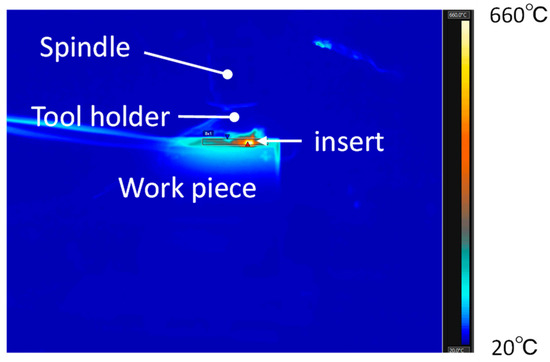 Figure 14 presents one example of an image captured by the thermal camera (FLIR, T650sc). With the camera, we were able to measure the temperature distribution and the maximum temperature in the frame. The maximum temperature near the tool edge was considered the cutting temperature. The spatial resolution of the thermal camera was 0.68 mrad. The cutting temperature was 158 °C on the third pass, 179 °C on the sixth pass, and 187 °C on the ninth pass when the workpiece temperature was room temperature. When heated to 300 °C, the cutting temperature was 530 °C on the third pass, 538 °C on the sixth pass, and 581 °C on the ninth pass.