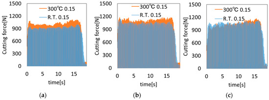 Figure 15. Transition of cutting force of the fabricated object at 300 °C and room temperature. (a) Third pass; (b) Sixth pass; (c) Ninth pass.