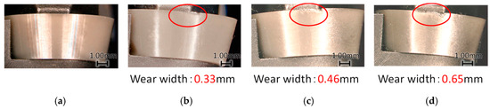 Figure 16. Tool wear progress at room temperature. (a) New tool; (b) After third pass; (c) After sixth pass; (d) After ninth pass.